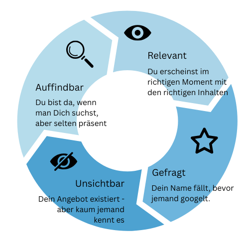 Unsere vier Sichtbarkeitsphasen – Unsichtbar, Auffindbar, Relevant und Gefragt – geben Ihnen eine schnelle Orientierung, wie Ihre Marke im Markt wahrgenommen wird und welche Hebel Sie als Nächstes ansetzen sollten. Die nachfolgende Grafik visualisiert jede Phase mit ihren typischen Merkmalen und zeigt Ihnen auf einen Blick, wie Sie von der Grundpräsenz bis zur Nachfragespitze wachsen können.