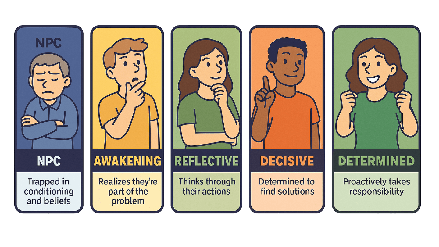 1. "NPC (Non-Playable Character):" Du bist im Autopilot, gefangen in deinen Routinen und konditionierten Glaubenssätzen, ohne echte Eigensteuerung.